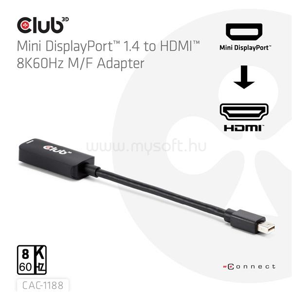 CLUB 3D ÁTALAKÍTÓ - CAC-1188 (MINI DP 1.4 TO HDMI 8K60HZ, AKTÍV, HDCP 2.2, 9 CM KÁBEL)