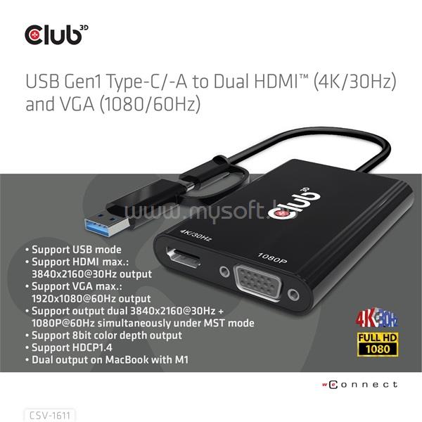 CLUB 3D ÁTALAKÍTÓ - CSV-1611(USB-C (USB-A ADAPTERREL) TO DUAL HDMI (4K/30HZ) / VGA (1080/60HZ))