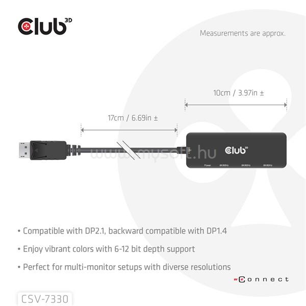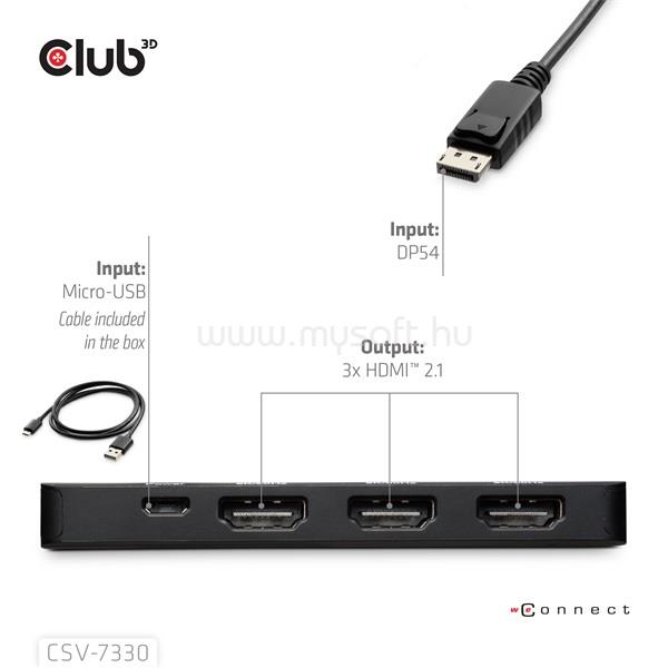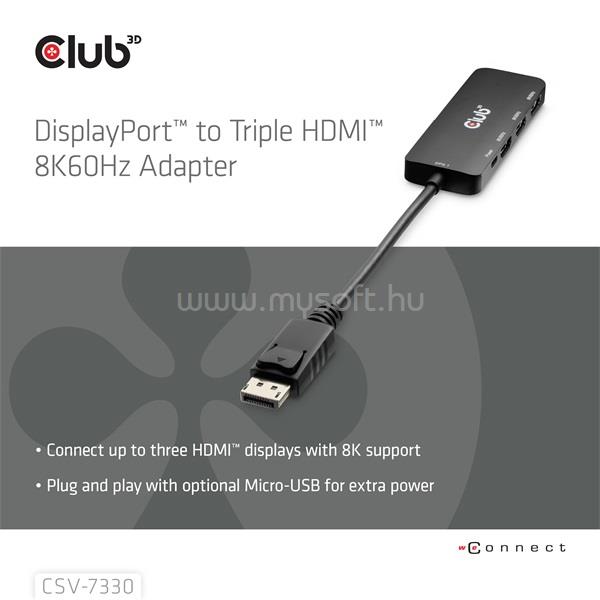 CLUB 3D Átalakító - CSV-7330 (DisplayPort 2.1 to 3xHDMI, 8K60Hz, HDR, HDCP 2.3, HPD, ALT mode)