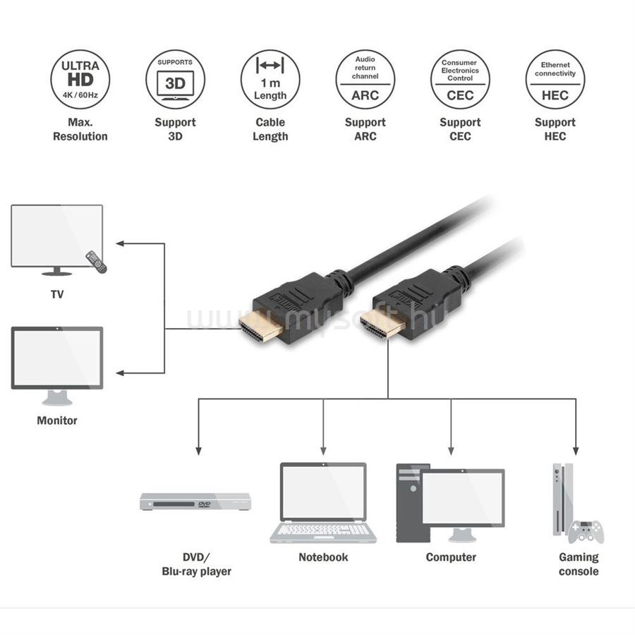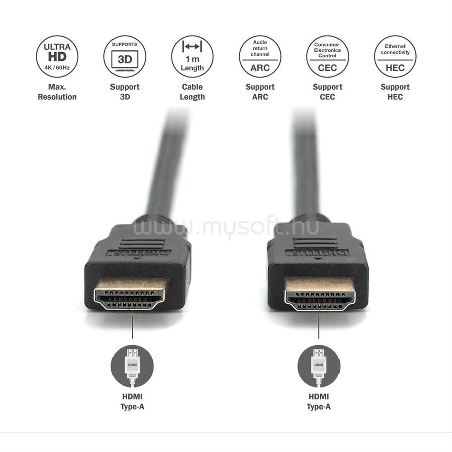 DIGITUS High Speed UHD 4K 30Hz 2.0 aranyozott Ethernet HDMI kábel 1m