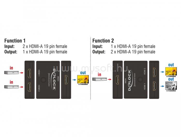• Ez a Delock HDMI-kapcsoló egy manuális, kétirányú kapcsoló különféle, HDMI-porttal rendelkező eszközök csatlakoztatásához. A kapcsoló két különböző alkalmazást kínál.