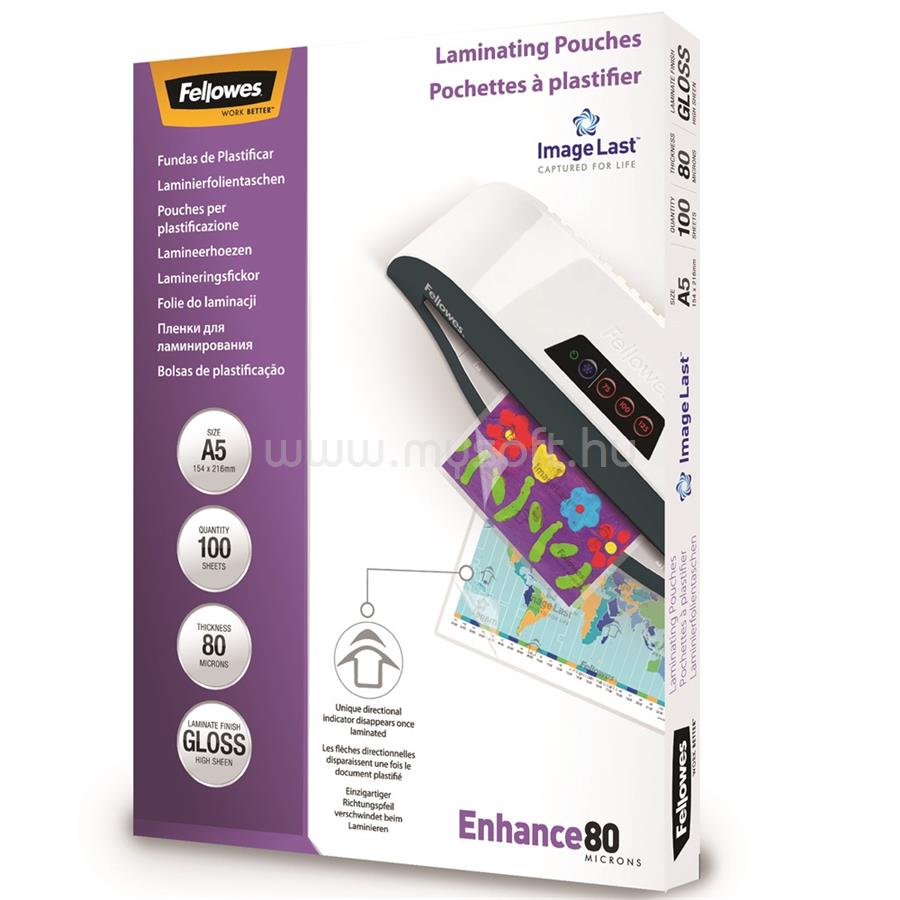 FELLOWES LAMINÁLÓ FÓLIA, A5, 80 MIKRON, FÉNYES, 100 DB/DOBOZ, FELLOWESR