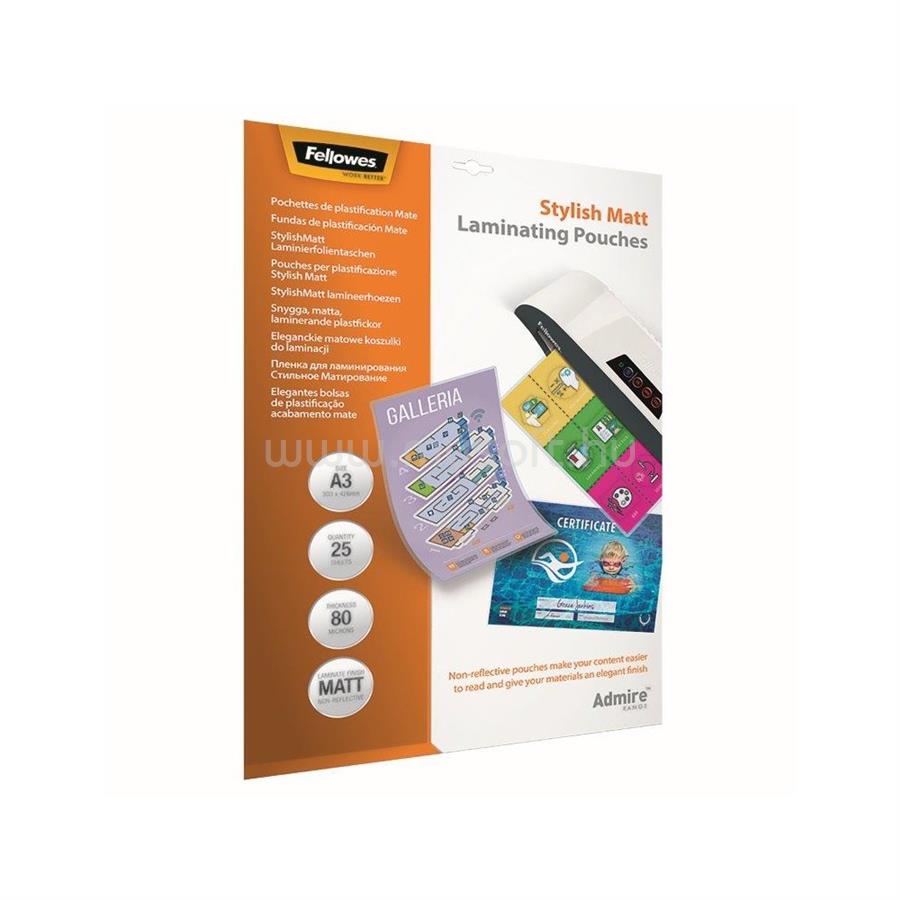 FELLOWES LAMINÁLÓ FÓLIA, A3, 80 MIKRON, MATT, ADMIRE STYLISH 25 DB/DOBOZ, FELLOWESR