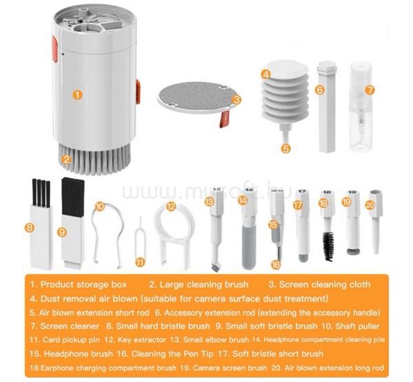 A 20 az 1-ben tisztítókészlet összesen 20 különböző eszközt tartalmaz, amelyek lehetővé teszik az eszközeid átfogó karbantartását. Találsz benne olyan elemeket, amelyek képernyők, billentyűzetek vagy fülhallgatók tisztítására szolgálnak, így minden helyzetben hatékonyan használhatók. Legyen szó por alapos eltávolításáról a billentyűk közül vagy a kijelző óvatos áttörléséről – ez a készlet mindent tartalmaz, amire szükséged lehet.