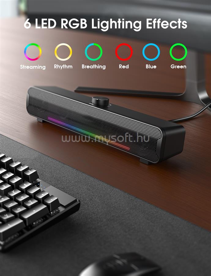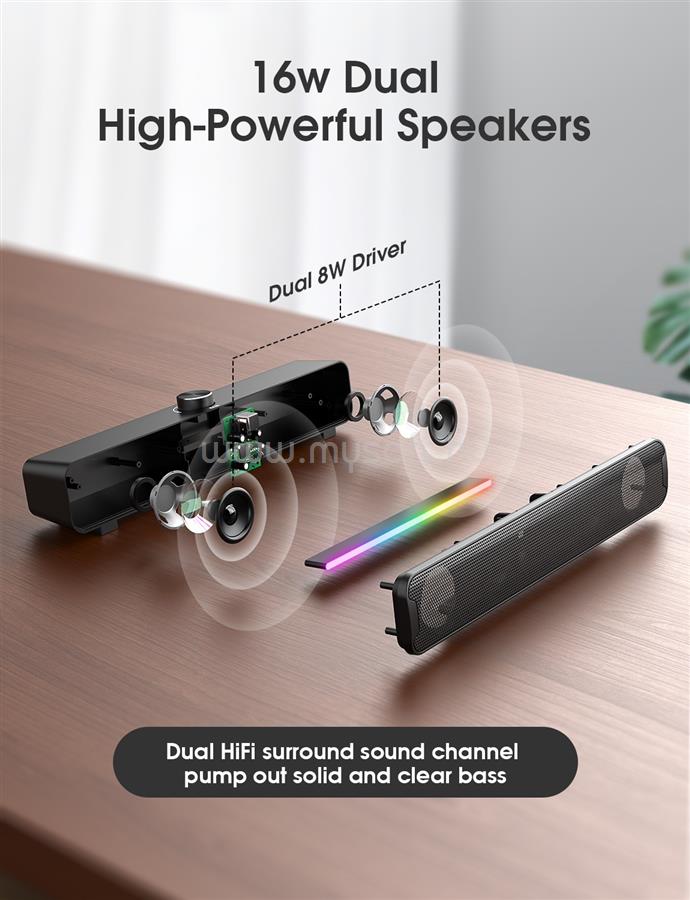 • A 1.5 méteres kábelhossz biztosítja a kényelmes elhelyezést, és a Soundbar könnyedén illeszkedik bármilyen térbe. A RGB világítás pedig tovább fokozza az élményt, különleges atmoszférát teremtve a szobádban. Válaszd ki a kedvenc színedet, és hangold az Onikuma L16 RGB Soundbart az aktuális hangulatodhoz.