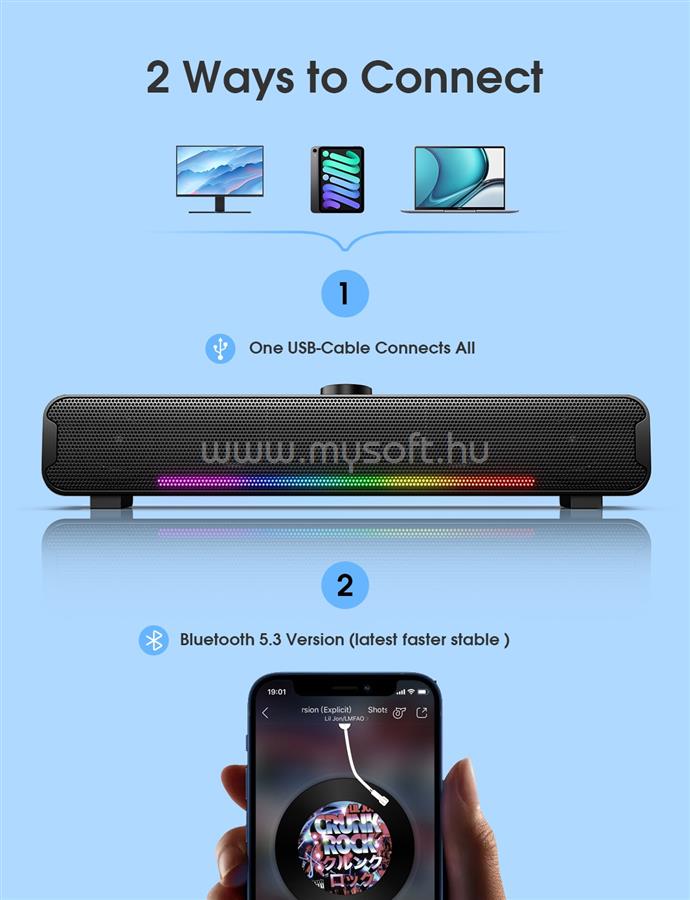 • A Soundbar kettős kapcsolat lehetőségét kínálja - csatlakoztasd a készülékedet egyszerűen USB vagy Bluetooth segítségével, és élvezd a vezeték nélküli szabadságot. A könnyű és ellenálló kialakításnak köszönhetően bárhová magaddal viheted, és pillanatok alatt beállíthatod.