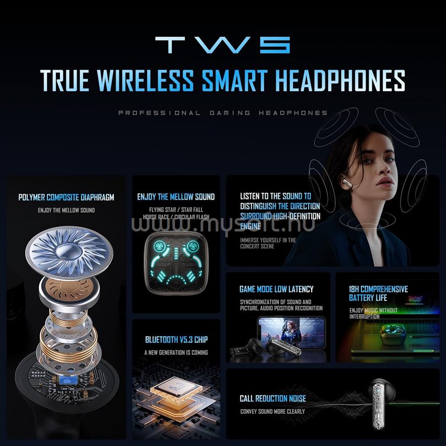 • Az Onikuma legújabb alkotása a TWS fejhallgatók új korszakának kezdetét jelenti. Ezek a fejhallgatók újraértelmezik a magával ragadó hangélményt, és olyan érzést nyújtanak, mintha a hangok középpontjában lennél. A 13 mm-es dinamikus meghajtóegységgel felszerelt fülhallgató gazdag zenei részleteket és erőteljes Hi-Fi hangzást biztosít. Ráadásul a basszusok izgalmasabbak, a középtartomány simább, a magas hangok pedig tisztábbak.